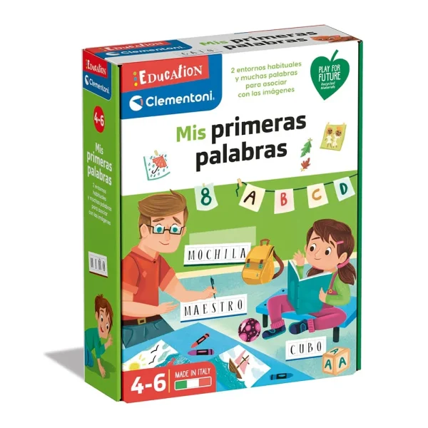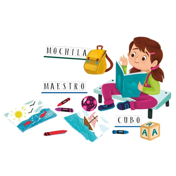 • Cuando se unen, sus 12 fichas presentan 2 ambientes habituales: una casa en una cara y una escuela en la otra. Los niños aprenderán a asociar 24 elementos familiares con sus correspondientes nombres.