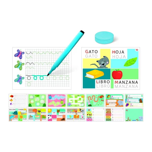 Un juego educativo simple y entretenido que enseña a los niños cómo escribir sus primeras letras y palabras usando los coloridos tableros de dibujo regrabables y marcadores especiales. Los tableros de dibujo reescritotables permiten a los niños practicar sus habilidades continuamente, mejorar su escritura. ¡Su hijo será introducido en el mundo de la escritura de una manera progresiva y entretenida!