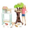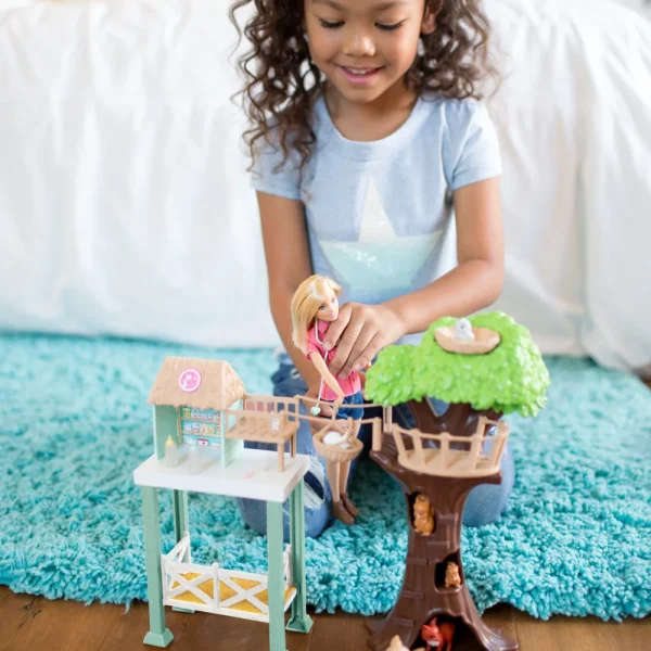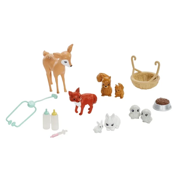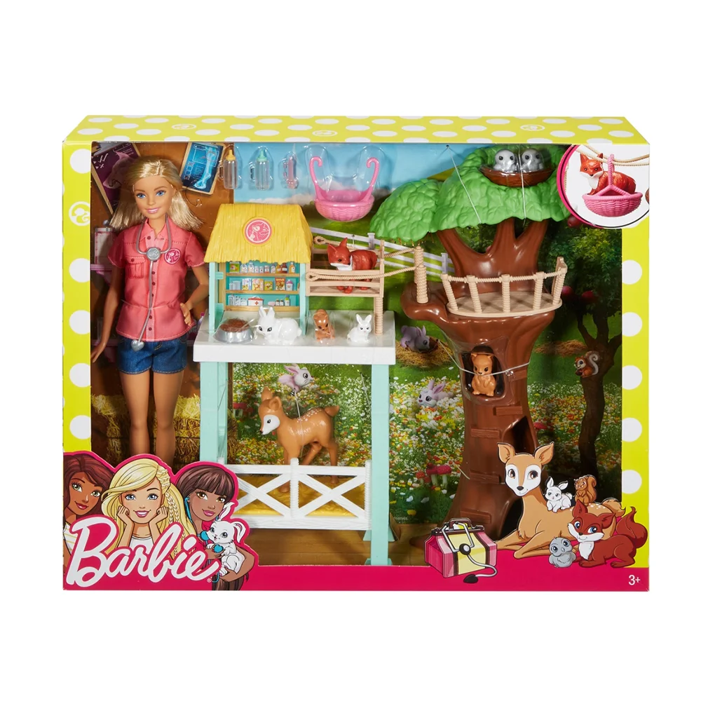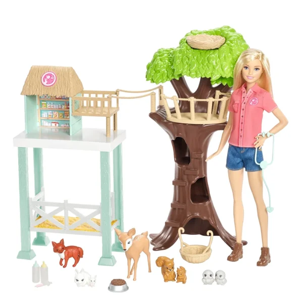 A la muñeca Barbie® le encantan los animales, así que está montando un centro de rescate… ¡donde viven para cuidarles! Con ocho pacientes animales, este set de juego de la muñeca Barbie® y el centro de rescate del bosque permite a los jóvenes amantes de los animales rescatarlos. Hay un bebé ciervo, un zorro, dos ardillas, dos conejitos y dos búhos. Diseñado con un entorno natural, el colorido centro de cuidados (con dos niveles) está conectado a un árbol mediante un puente de cuerda que funciona con la canasta para transportar animales. El árbol cuenta con muchos lugares de descanso para los animalitos, como el nido sobre las hojas, huecos en el tronco y una plataforma entre las ramas. El puesto de cuidados de la muñeca Barbie®, doctora de animales, tiene dos pisos de altura y elementos divertidos como un tejado de paja con el logotipo de Barbie® en la parte superior, colores lindos y calcomanías por todas partes y una cama para animales debajo. La muñeca Barbie® está lista para ver a los pacientes con una camisa de cuello, shorts y botas. Un estetoscopio, dos biberones y un comedero la ayudarán a cuidar de los animales. A las jóvenes les encantará jugar a hacer realidad sus aspiraciones con este centro de rescate de animales porque con Barbie®, ¡tú puedes ser lo que quieras ser! Incluye una muñeca Barbie® vestida con ropa de moda y accesorios, un centro de cuidados, un árbol, ocho animales y accesorios. La muñeca no puede estar de pie por sí sola. Los colores y la decoración pueden variar.