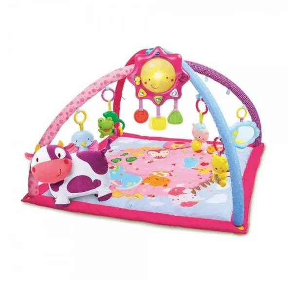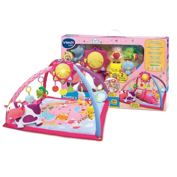 ¡Una mantita para jugar y soñar! Podrá colocar al bebé en dos posiciones, boca arriba o boca abajo, para disfrutar de la suave mantita o del gimnasio. Ambas posturas estimularán sus sentidos y le ayudarán a fortalecer brazos y piernas, a la vez que desarrollan su motricidad. La mantita es lavable a máquina, muy fácil de transportar y contiene un cojín con forma de simpática vaca. Incluye un sol luminoso con tres modos de juego, sensor de movimiento y siete elementos móviles para jugar sin parar.