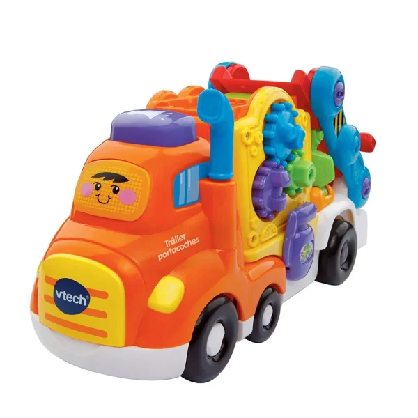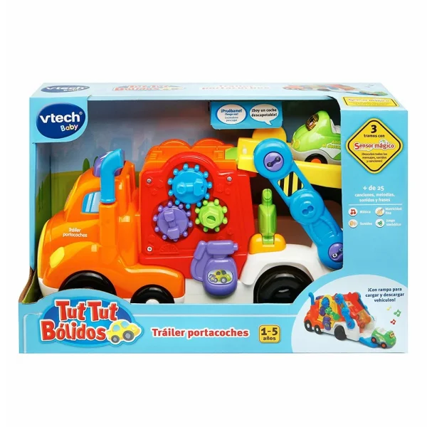 Puede transportar hasta 5 vehículos Tut Tut. El camión dispone de una portezuela en la parte trasera para evitar que los coches se caigan.
