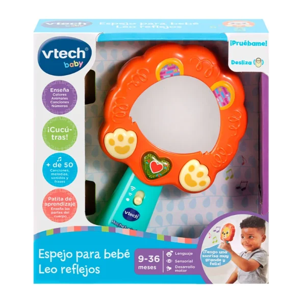 Espejo sonajero para bebés +12 meses. ¿Quién es esa monada que veo en el espejo? ¡Descubre a Leo reflejos! Este espejito interactivo divertirá a los más peques mientras se descubren a sí mismos. Pulsa uno de sus botones con forma de patita para ver la cara del león y escuchar divertidas frases, canciones y melodías.